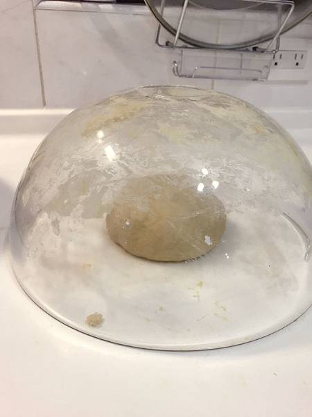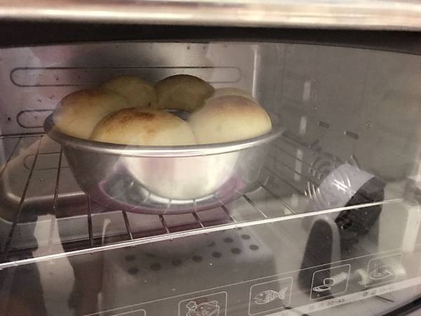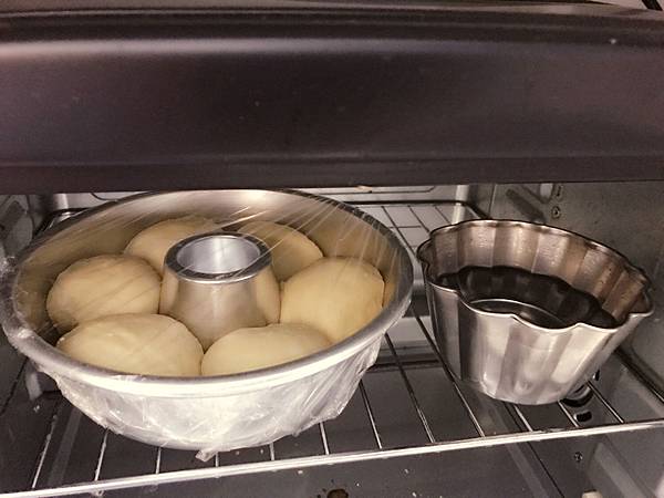30分鐘後,打開烤箱把麵糰跟水拿出來